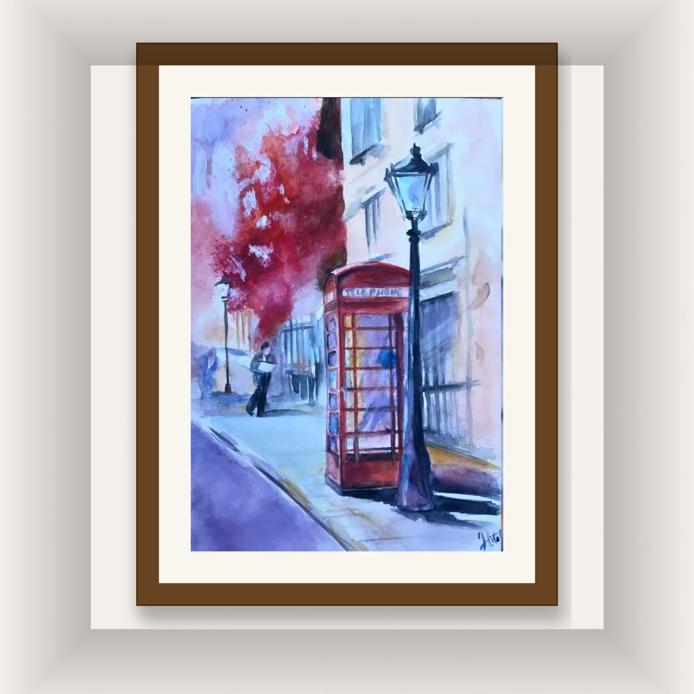 Kırmızı telefon kulübesi ve arka plandaki ağaçtan yükselen sıcak tonlar, Londra’nın serin sokaklarına duygusal bir dokunuş katıyor. Suluboyanın akışkan geçişleri, şehir hayatının hareketini ve romantik bir anın dinginliğini aynı karede buluşturuyor.