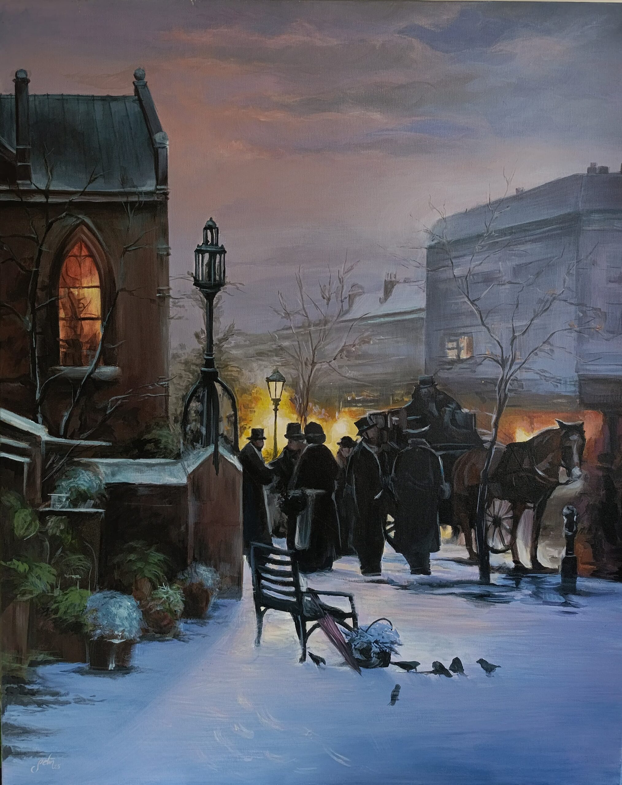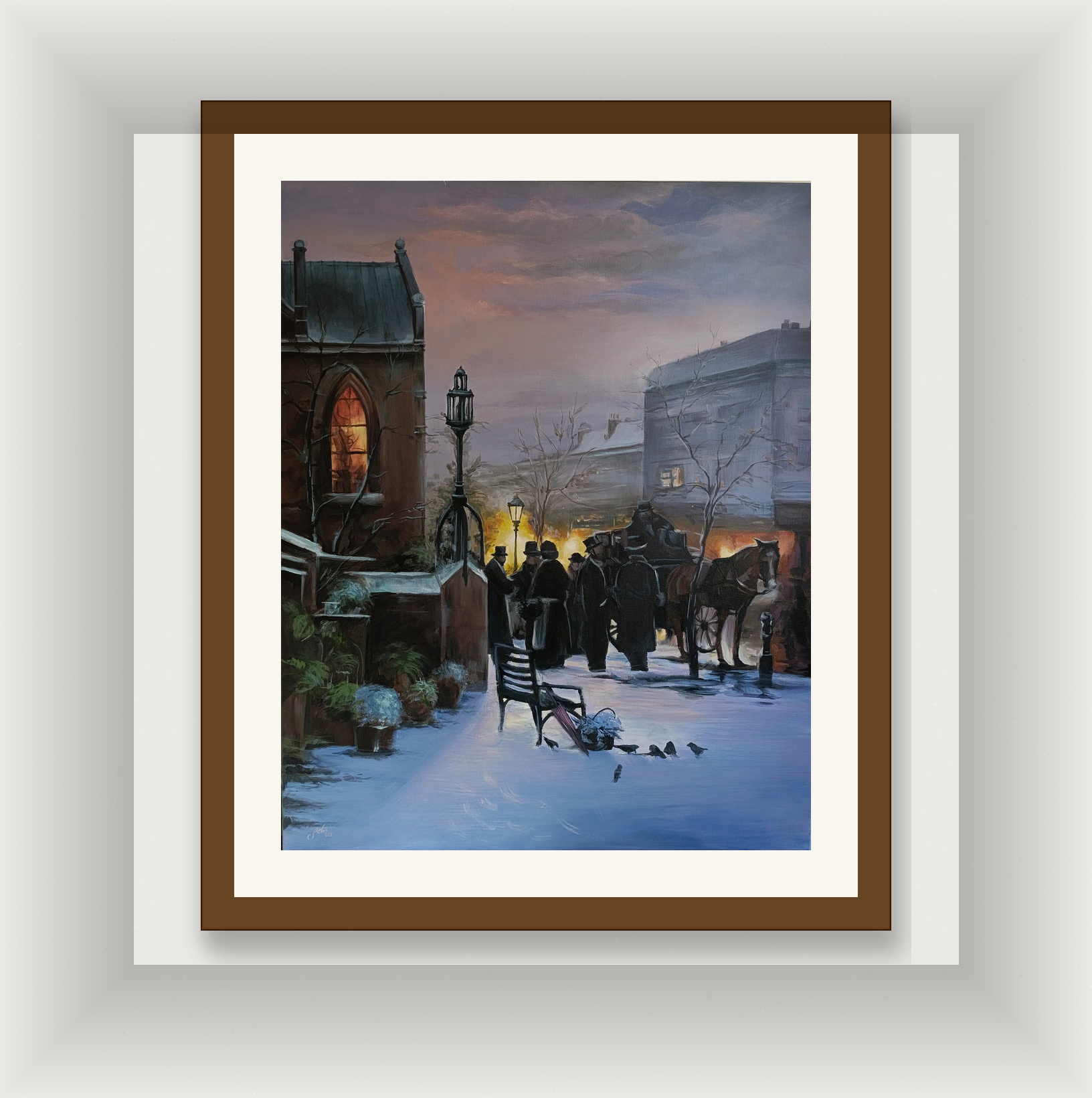 Viktorya dönemi mimarisi ve dönemin ruhunu yansıtan figürlerin (silindir şapkalı beyler, atlı arabalar) kullanımı, esere tarihi bir belge niteliği katıyor. Tablodaki en çarpıcı detay, binaların pencerelerinden ve sokak lambalarından sızan o sıcak, turuncu ışık; bu ışık, dışarıdaki dondurucu soğuğa rağmen içeride bir yerlerde hayatın ve sıcaklığın devam ettiğini fısıldıyor. Gökyüzünün puslu yapısı ve çıplak ağaç dalları, kışın o dingin ama güçlü atmosferini tamamlıyor.