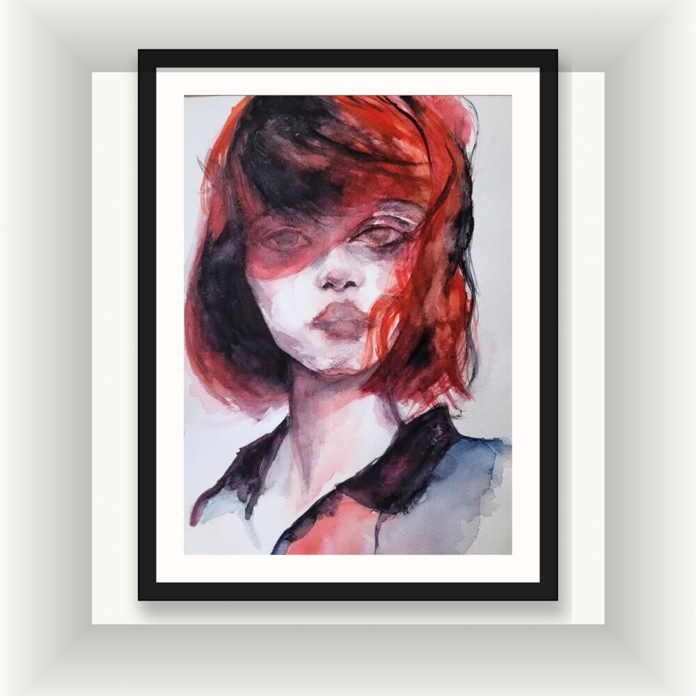 Kırmızının koyu ve yoğun tonlarıyla hayat bulan bu buğulu suluboya portre, tutkunun ve gizemin estetik bir yansımasıdır. Dağılan pigment geçişleri figüre romantik bir sis etkisi kazandırırken, koyu kızıl tonlar güçlü ve çarpıcı bir enerji yaratır. Yüz hatlarının yarı belirsizliği izleyeni hikâyenin içine çeker; her bakışta farklı bir duygu keşfedilir. Bu eser, feminen gücü ve içsel ateşi zarif bir kompozisyonla buluşturur.