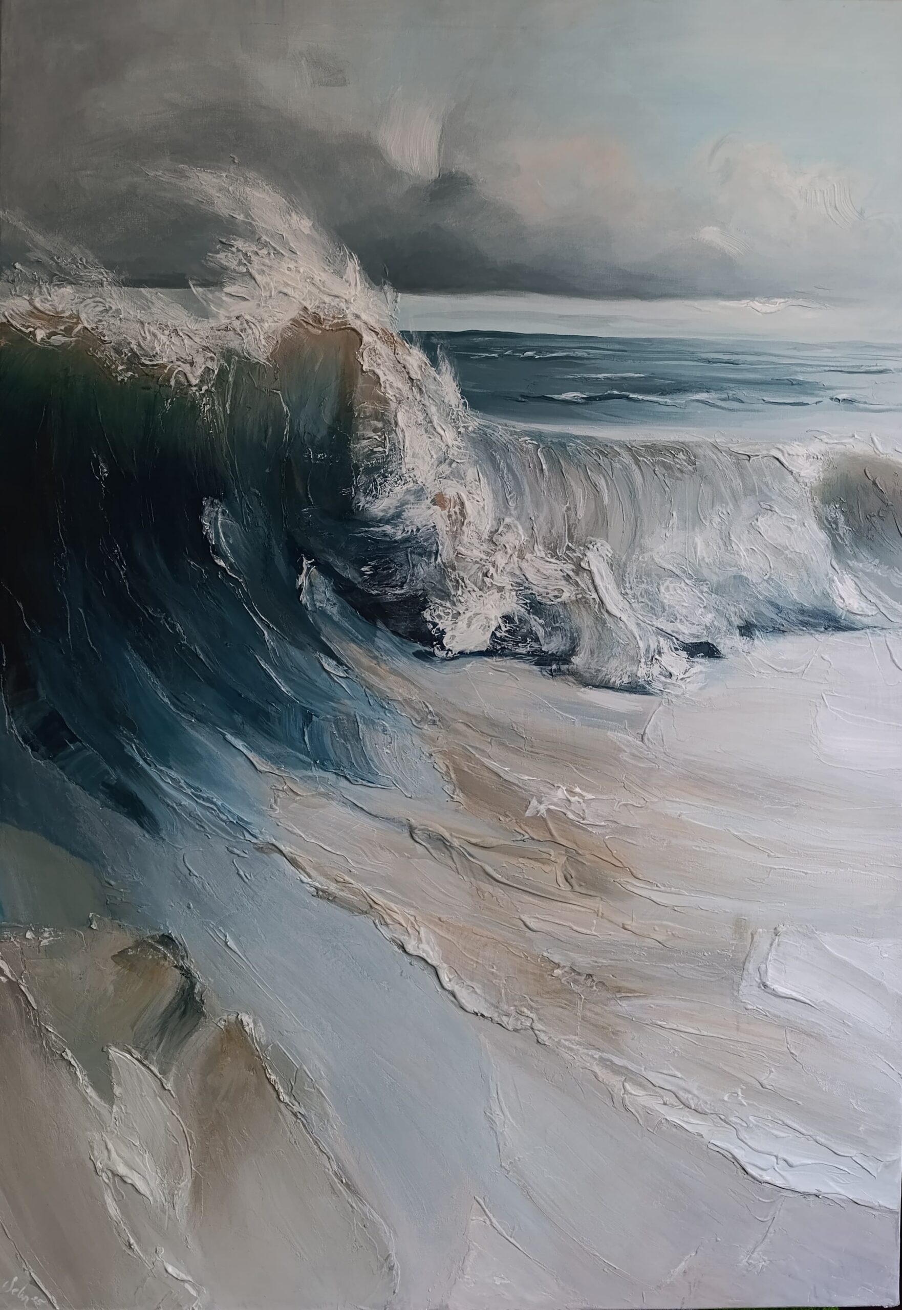 Bu çarpıcı deniz peyzajı, doğanın evcilleştirilemez gücünü impasto tekniğinin en uç örneğiyle sergiliyor. Sanatçı, dalgaların kıyıya vurduğu o kırılma anını sadece görsel olarak değil, fiziksel bir dokuyla (kabartma formunda) işlemiş. Beyaz köpüklerin yoğunluğu ve dalganın gölgesindeki derin lacivert tonlar, izleyicide denizin tuzlu serinliğini ve uğultusunu hissettiren bir illüzyon yaratıyor.