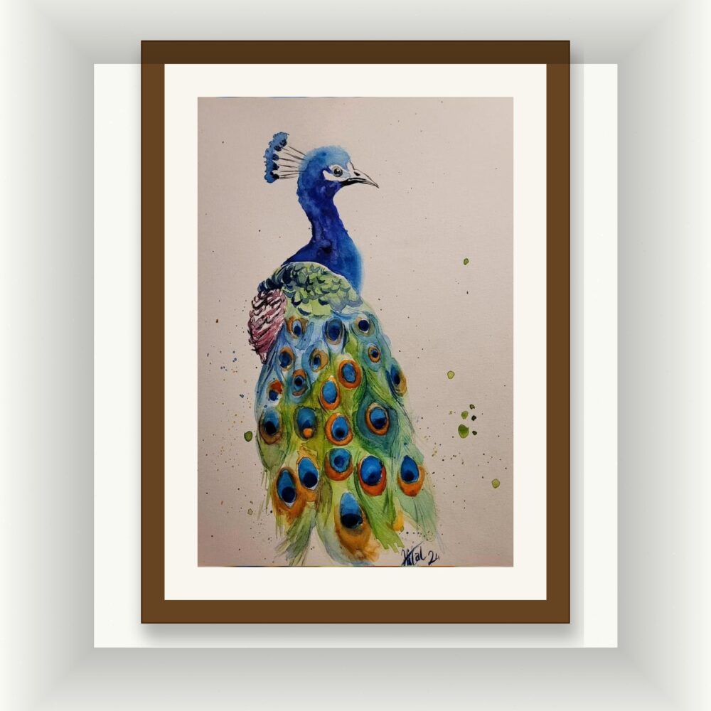 Suluboyanın akışkan ve canlı renk geçişleriyle hayat bulan bu tavus kuşu çalışması; zarafetin, özgüvenin ve ihtişamın sembolüdür. Kuyruktaki göz formundaki detaylar ve mavi-yeşil tonların güçlü kontrastı, tabloyu bulunduğu mekânda dikkat çekici bir odak noktası haline getirir.