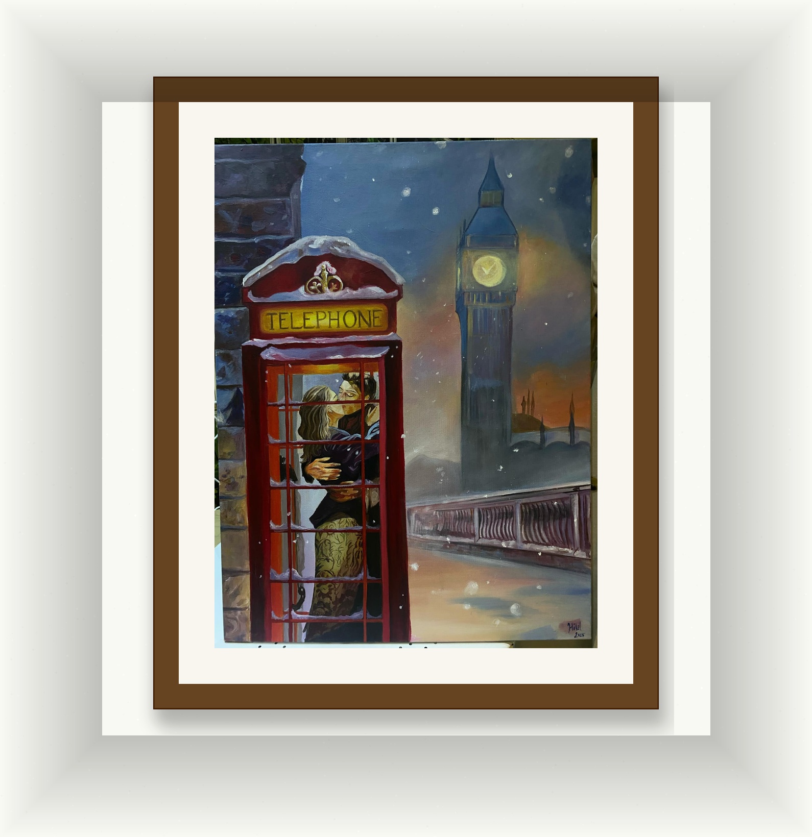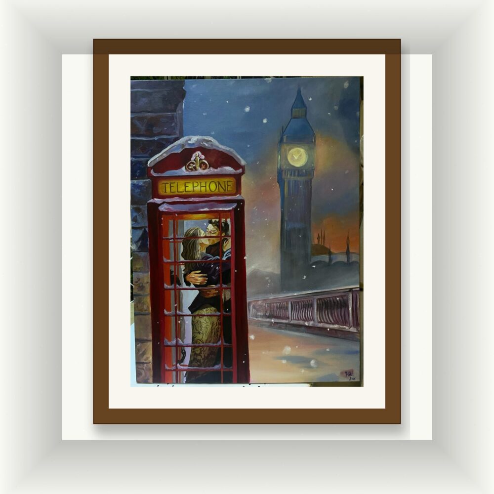 Karlı bir Londra gecesi… Kırmızı telefon kulübesinin içinde dünyadan izole olmuş iki âşık. Arka planda saat kulesinin silueti, zamanın akmaya devam ettiğini hatırlatırken; bu sarılış anı zamanı durduruyor. Soğuk mavi tonların arasından yükselen sıcak kırmızı, tutkunun ve özlemin güçlü bir sembolü.