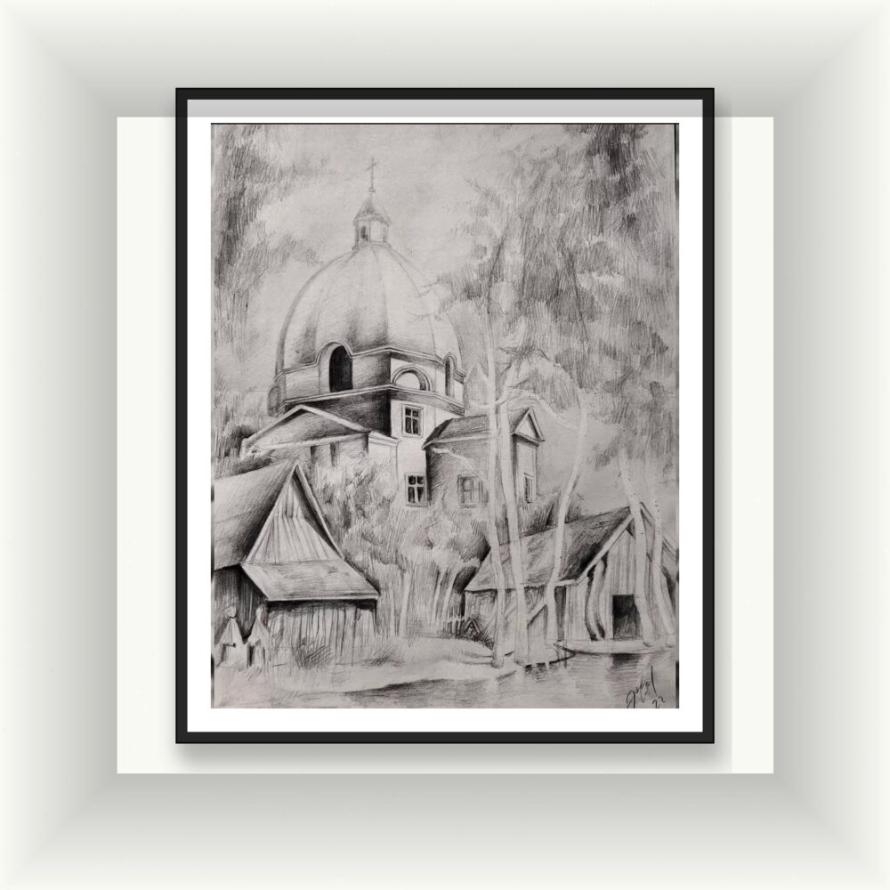 Mimari güzelliği doğayla buluşturun! Kubbeli kilise mimarisi ve ağaçların birleştiği bu atmosferik çizim, Avrupa kasabalarının huzurlu ambiyansını yansıtıyor. Tarih ve doğa severlerin beğenisine sunulan özel bir eser.