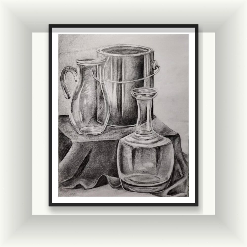 Kurşun kalemin incelikli ton geçişleriyle hayat bulan bu natürmort çalışma; şeffaf cam yüzeylerin yansımasını, metal dokuların sertliğini ve kumaşın yumuşak kıvrımlarını ustalıkla bir araya getiriyor. Siyah-beyazın zamansız estetiği, mekâna sade ama güçlü bir karakter kazandırır.