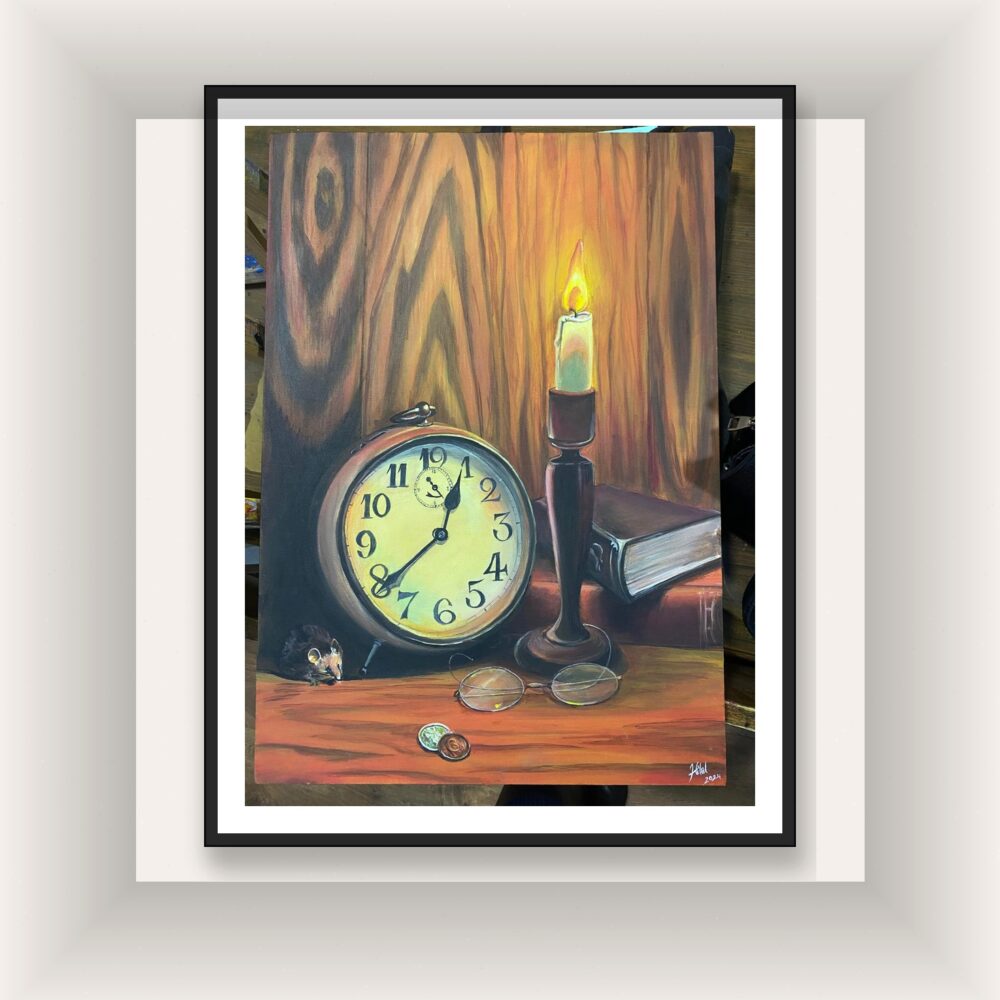 Mekanınıza zamansız bir zarafet katın! Bu büyüleyici natürmort çalışması, ahşap dokuların sıcaklığı ile antika saatin nostaljik zarafetini bir araya getiriyor. Mum ışığının yarattığı gizemli atmosfer, evinize veya ofisinize klasik bir dokunuş kazandırır.